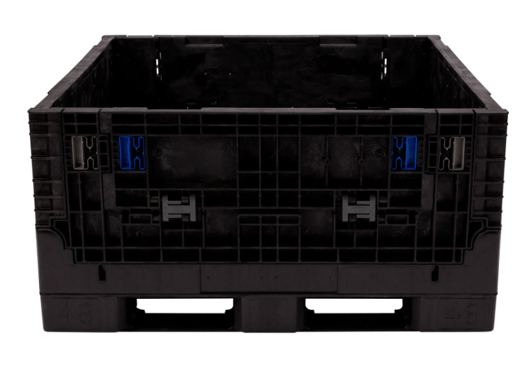 Collapsible bulk containers have easy-to-use snap lock latches for easy collapsibility.