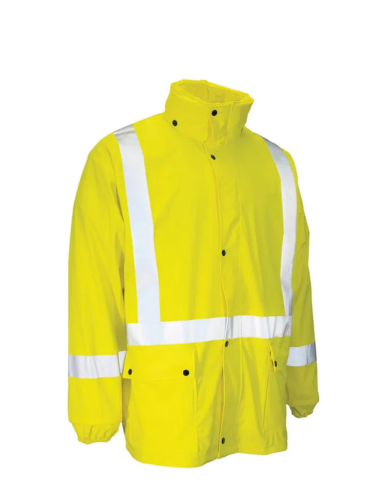 This flame-resistant, waterproof safety rain jacket offers unbeatable protection in wet and hazardous conditions—without sacrificing comfort or visibility.